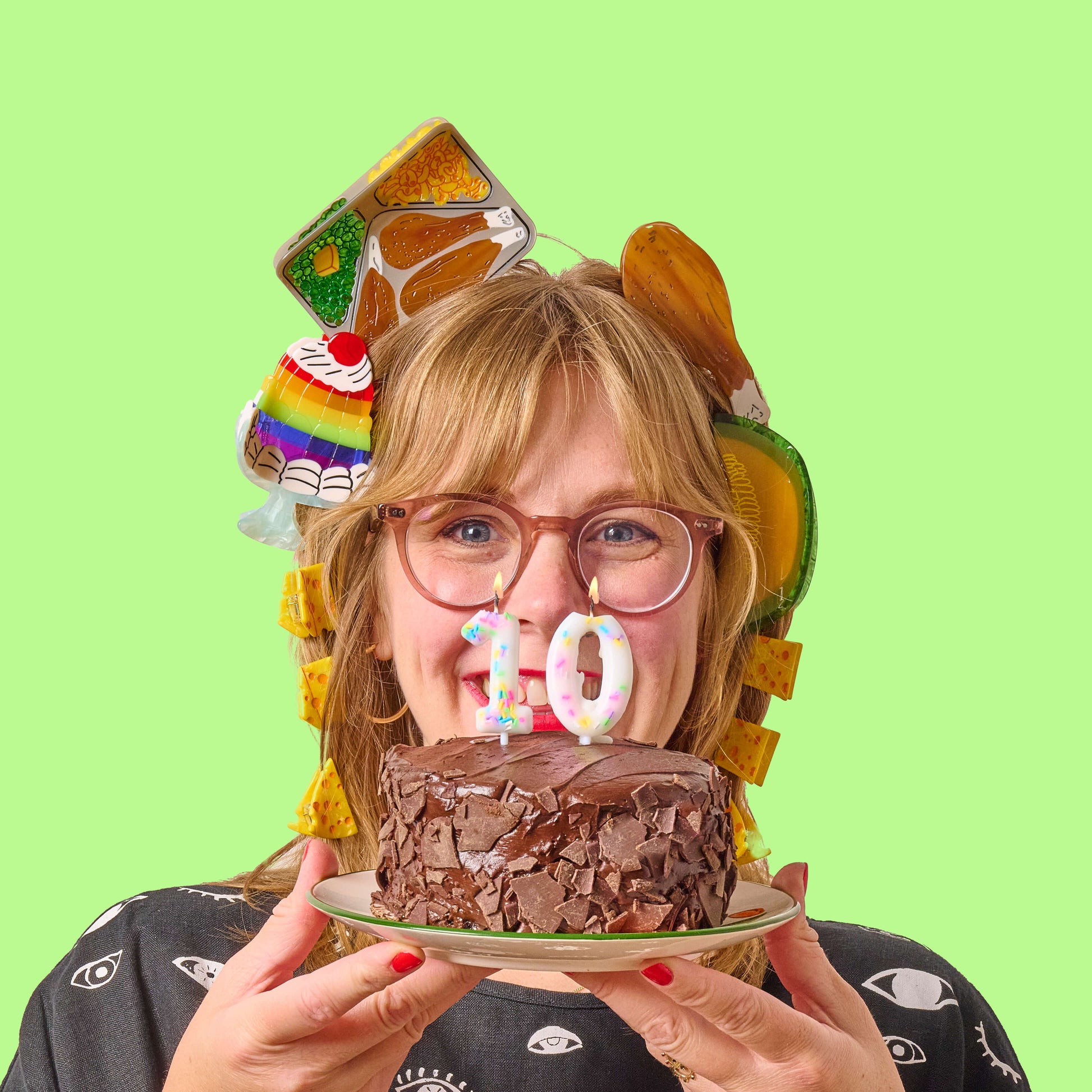 Say cheese! This adorable mini hair claw set of 6 is handmade and hand-painted from cellulose acetate, a plant-based plastic alternative. Each claw measures approximately 1" x 1" x .5" and features unique color variations, making every set one-of-a-kind. Add a playful, cheesy twist to your hairstyle with these tiny but mighty clips.